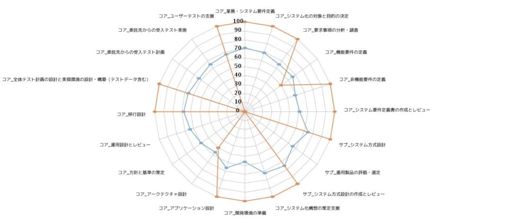 - 過去からの成長度合い、目標レベル到達状況を把握